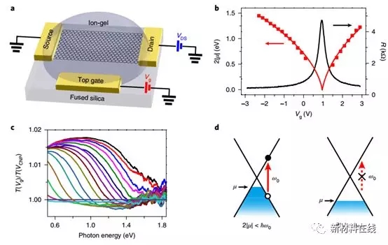 当高强度光(超过 1010 W·m-2)与非线性材料相互作用时会发生光谐波产生。通过对非线性光学响应的电控制能够实现门控可调开关和变频器等应用。石墨烯显示出了非常强的光-物质相互作用以及宽带可电调谐的三阶非线性极化率。Sovai 等人表明,通过控制费米能量和入射光子能量,石墨烯中的三次谐波产生效率可以增加接近两个数量级。这种增强是来源于共振多光子跃迁引起的非线性电导率虚部中的对数共振。无质量狄拉克费米子的线性色散使得能够在超宽带上实现可门控的三次谐波增强,从而为光通信和信号处理应用中的宽带可电调变频器铺平了道路。(Nature Nanotechnology DOI: 10.1038/s41565-018-0145-8)